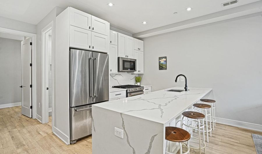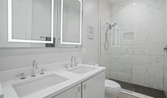 Perched high atop a hill on a quiet one-way street, this bright and beautifully appointed 2-bedroom, 2-bath condominium offers both comfort and security. A gated entry from the road provides an added layer of privacy, while the building's elevated position creates a serene setting tucked away from the street below. Inside, nearly 1,000 square feet of thoughtfully designed living space awaits. Soaring 9.5-foot ceilings and large windows fill the home with natural light, giving this first-floor terrace unit an airy, open feel. The kitchen features sleek quartz countertops, modern cabinetry, and subtle floor LED lighting-perfect for both everyday living and entertaining. The spacious primary suite includes a closet with custom organizers and a luxurious ensuite bath boasting a dual vanity, white marbled porcelain tile, and two illuminated LED mirrors. The second bedroom offers flexibility for guests or a home office (or both) and another beautifully finished full hallway bath. Additional highlights include in-unit washer and dryer, custom closet systems and recessed lighting throughout, and two private outdoor patio spaces-ideal for morning coffee or unwinding at day's end. Can't forget the whole home built-in bluetooth speaker system as well! Parking is effortless with a highly coveted assigned garage space, a rare find at this price point. With a low monthly condo fee of just $236, residents enjoy exceptional value without sacrificing style or convenience. Originally converted to condos in 2018, this boutique building blends modern finishes with timeless appeal in a prime, peaceful location.